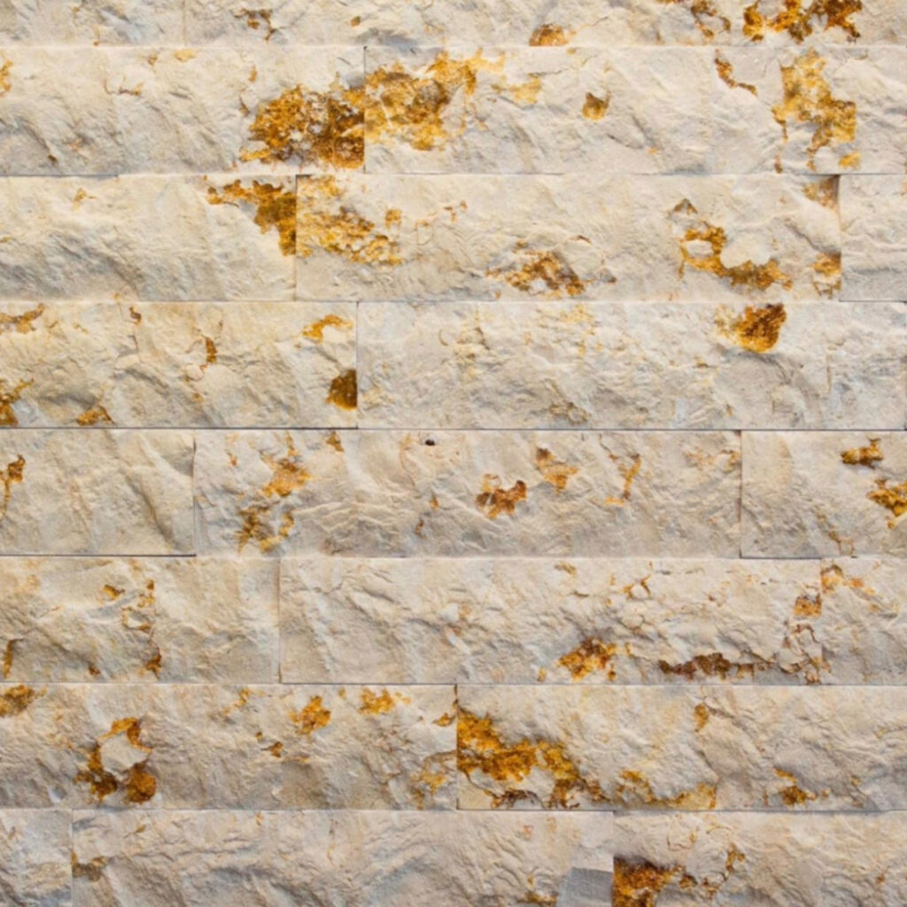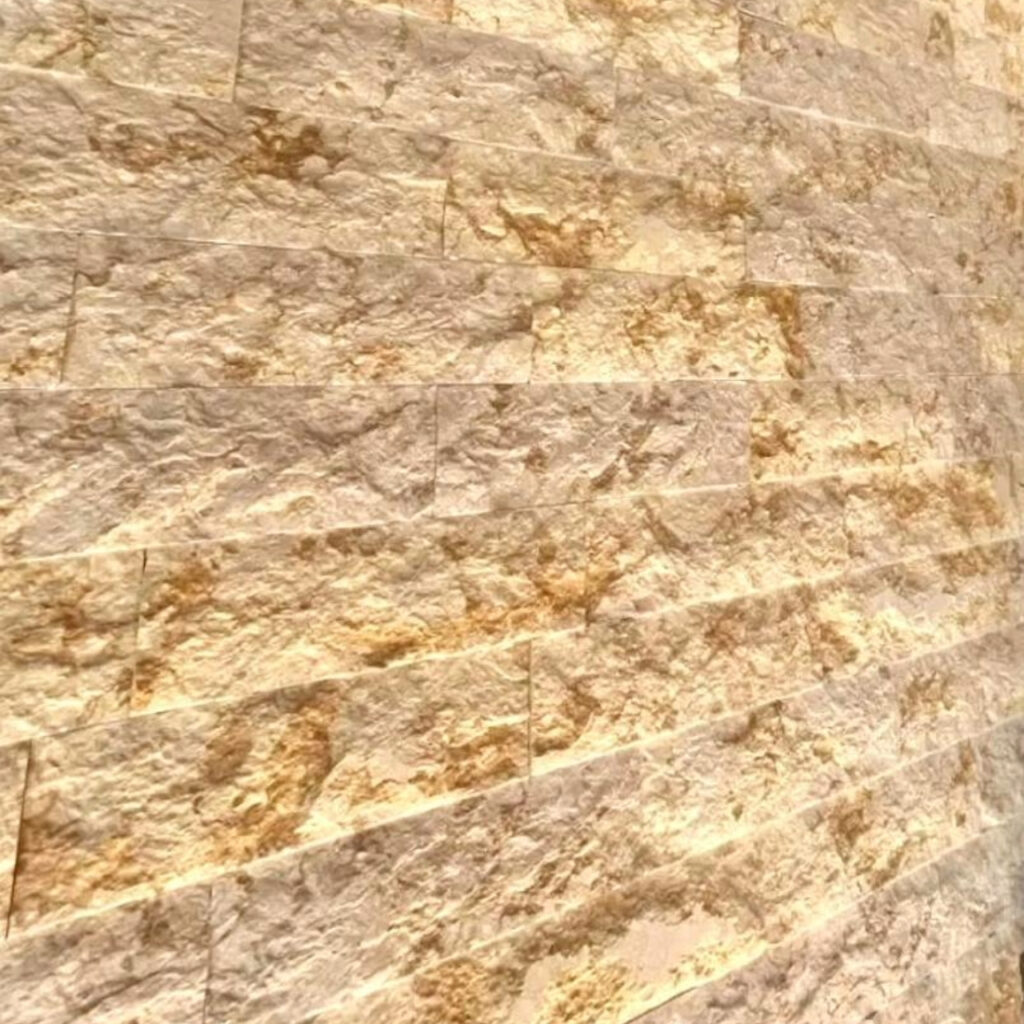 Sua textura rústica revela relevos naturais e veios dourados que percorrem a pedra com elegância orgânica, criando superfícies de presença profunda e autêntica.