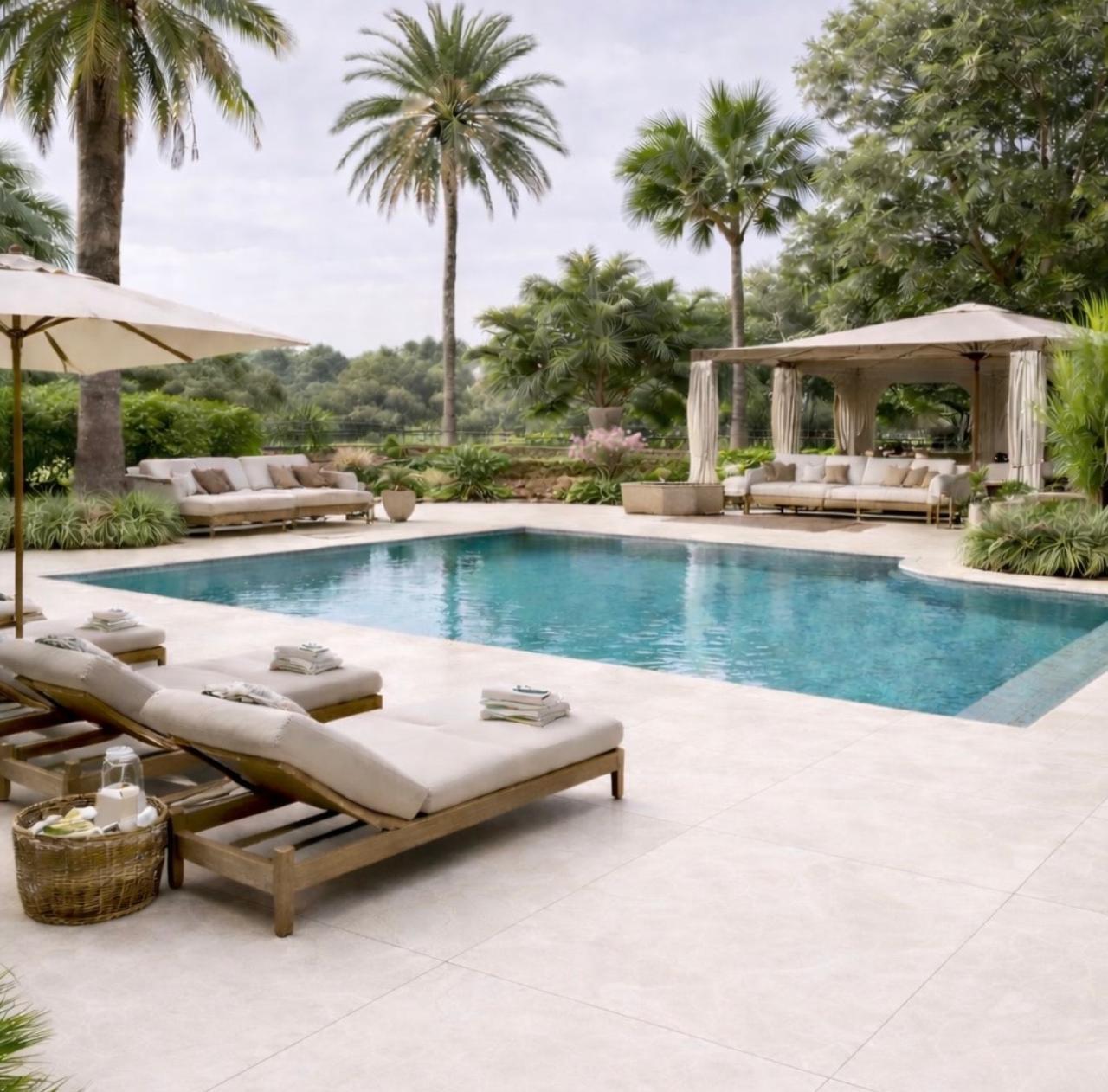 Sua tonalidade clara e seus veios sutis permitem combinações elegantes com madeira, concreto aparente, metais naturais e paisagismo tropical, criando composições equilibradas e sofisticadas.